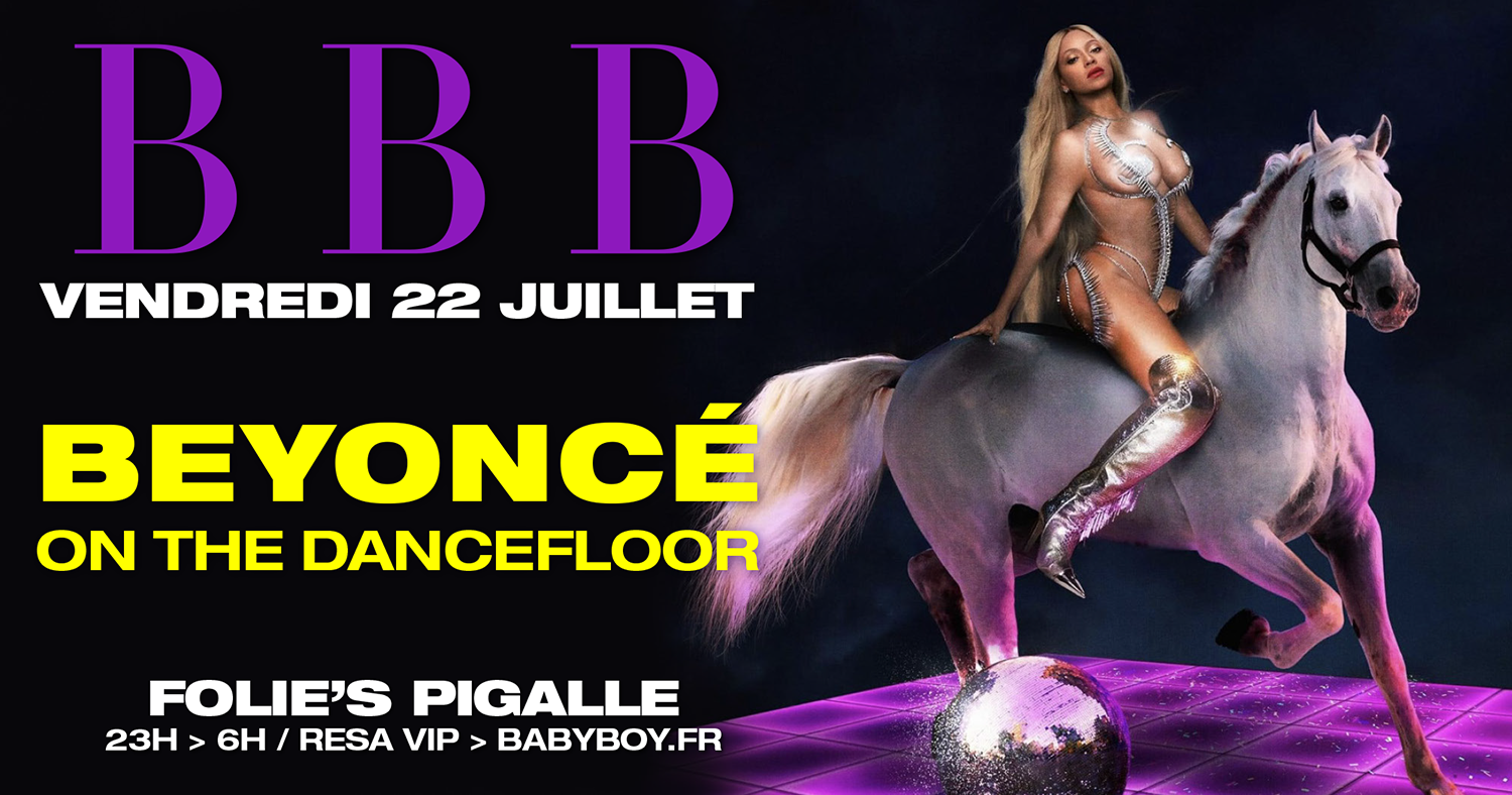 BBB BEYONCÉ ON THE DANCEFLOOR Friday, July 22, 2022 11:00 PM 23:00 Saturday, July 23, 2022 6:00 AM 06:00 FOLIE'S PIGALLE 11 Place Jean Baptiste Pigalle 75009 Paris France (map) Google Calendar ICS VENDREDI 22 JUILLETBBB BEYONCÉ ON THE DANCEFLOORFOLIE’S PIGALLE11 Place Jean Baptiste Pigalle, 75009 Paris PASS GRATUITS RÉSERVER UNE TABLE